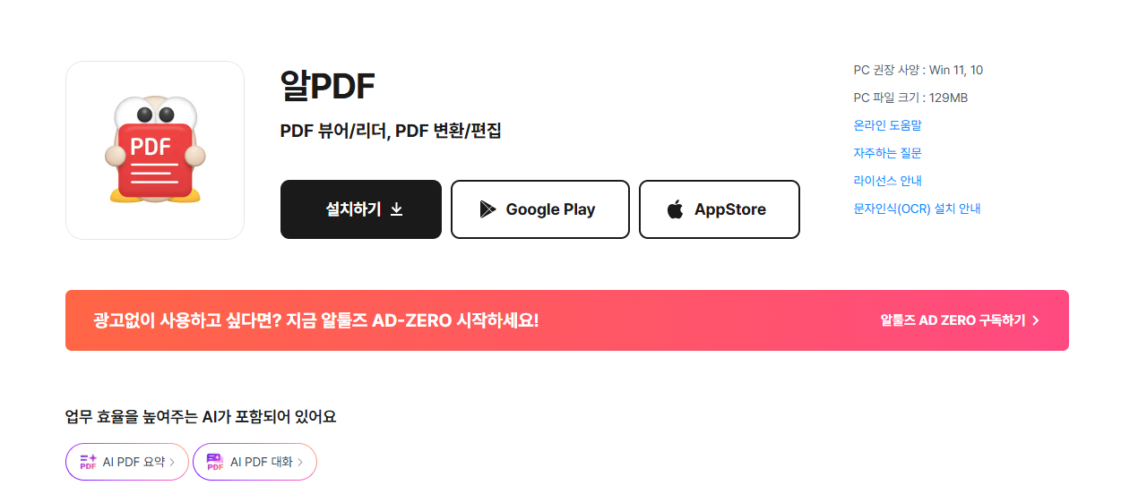 알PDF 설치는 프로그램 다운로드 후 아래 절차를 따릅니다.